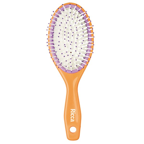 Escova de cabelo com base almofadada que proporcionam uma escovação muito mais confortável e cerdas de nylon com pontas protetoras que massageiam o couro cabeludo.