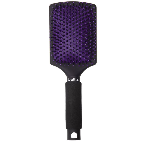 Escova de cabelo com base almofadada que proporcionam uma escovação muito mais confortável e cerdas de nylon com pontas protetoras que massageiam o couro cabeludo.