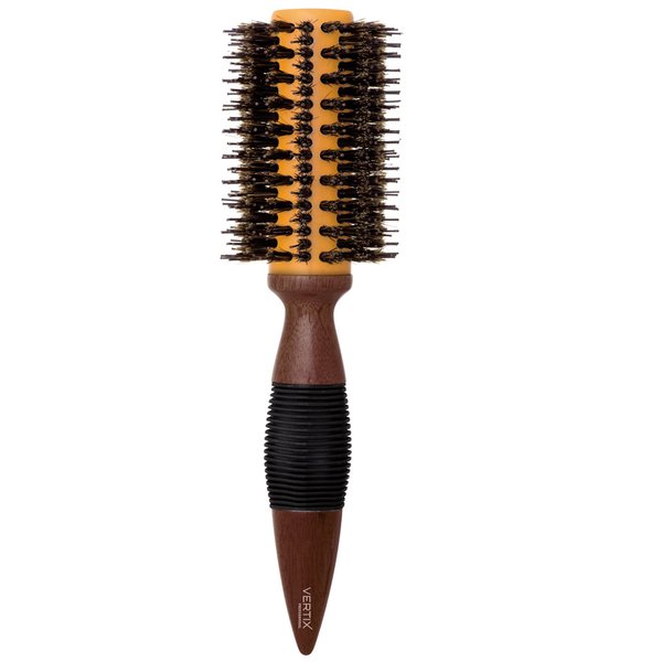 Escova redonda de madeira com base de cerâmica e cerdas naturais de javali intercaladas com pinos de nylon. A base de cerâmica retém o calor do secador por mais tempo, além de distribui-lo mais uniformemente. As cerdas e pinos proporcionam a tração ideal para cabelos mais volumosos e difíceis de penetrar.
