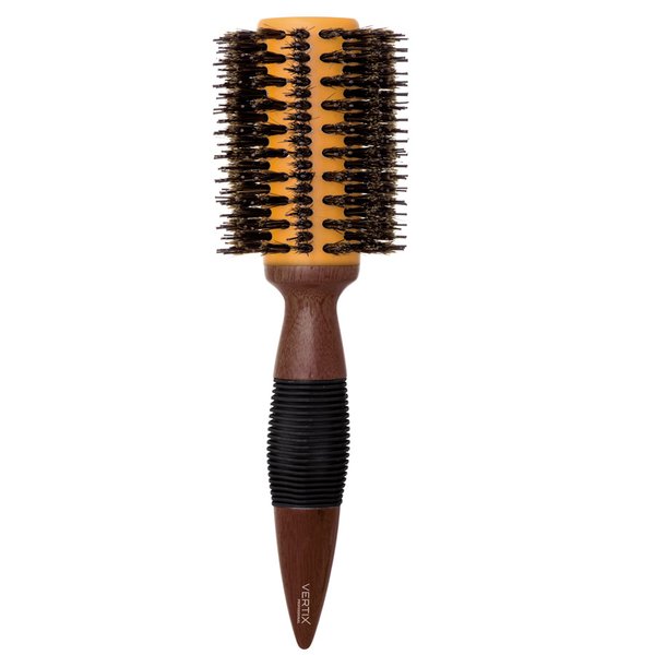 Escova redonda de madeira com base de cerâmica e cerdas naturais de javali intercaladas com pinos de nylon. A base de cerâmica retém o calor do secador por mais tempo, além de distribui-lo mais uniformemente. As cerdas e pinos proporcionam a tração ideal para cabelos mais volumosos e difíceis de penetrar.