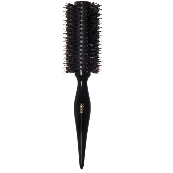 Escova redonda de madeira com cerdas naturais de javali intercaladas com pinos de nylon.