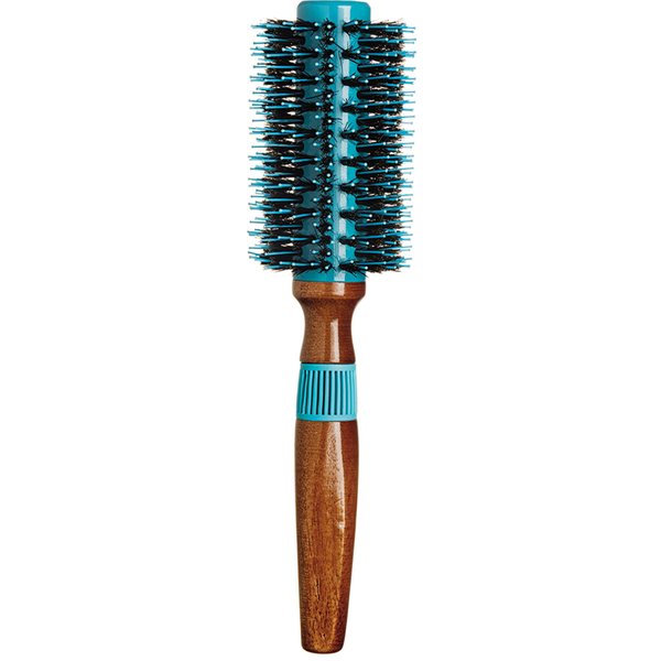 Escova redonda de madeira com base de alumínio e cerdas naturais de javali intercaladas com pinos de nylon. A base de alumínio absorve rapidamente o calor do secador, acelerando o processo de alisamento dos fios. As cerdas e pinos proporcionam a tração ideal para cabelos mais volumosos e difíceis de penetrar.