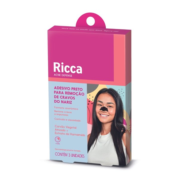 Função Os adesivos Ricca removem os cravos do nariz e as impurezas da pele, deixando o nariz com aspecto mais liso e limpo. Modo de Uso 1. Umedeça a pele do nariz com água, aplique o adesivo com o lado brilhante voltado para a pele e pressione o adesivo. 2. Deixe agir por 15 minutos (o adesivo irá enrijecer e secar) 3. Puxe o adesivo começando pelas bordas, e pronto!