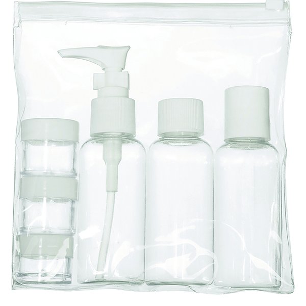 Kit de viagem contém 3 frascos, 3 potes e uma nécessaire transparente para levar para onde quiser.