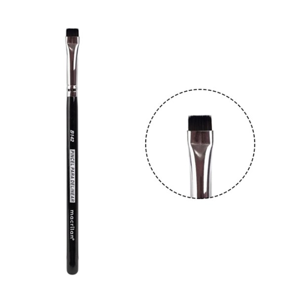 Pincel Macrilan B142, especialmente desenvolvido com cerdas sinteticas e firmes e com formato especial para definir os olhos. Ideal para traçar linhas e delineados na linha superior ou inferior dos cílios.