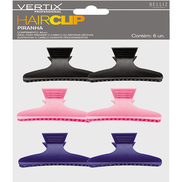 Piranha para cabelo com clip de plástico, da marca Vertix, embalagem com 6 unidades nas cores preta, rosa e azul.