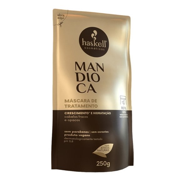 Possui em sua formulação o óleo de mamona que fortalece os fios e tem alto poder hidratante, e também vitamina E, que combate o envelhecimento dos fios. A fórmula combina tutano, mamona e pró-vitamina B5 e assim a Máscara de Hidratação Mandioca Haskell revitaliza e promove hidratação intensa, força e ajuda no crescimento dos cabelos.
