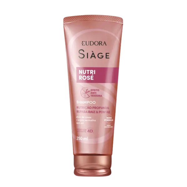 A linha Siàge Nutri Rosé é enriquecida com um poderoso Elixir de Rosas, rico em vitaminas e antioxidantes que nutrem os fios e tem auto poder de reparação, combinado a natural Argila Vermelha que nutre os fios, promovendo equilíbrio ao couro cabeludo e reparação profunda da raiz as pontas.