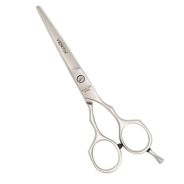 Tesoura em aço inoxidável com lâmina convexa tamanho 5,5" fio navalha, acabamento polido e cabo anatômico simétrico – ambidestro. Possui parafuso interno ajustável, amortecedor de impacto de silicone e descanso de dedo removível.