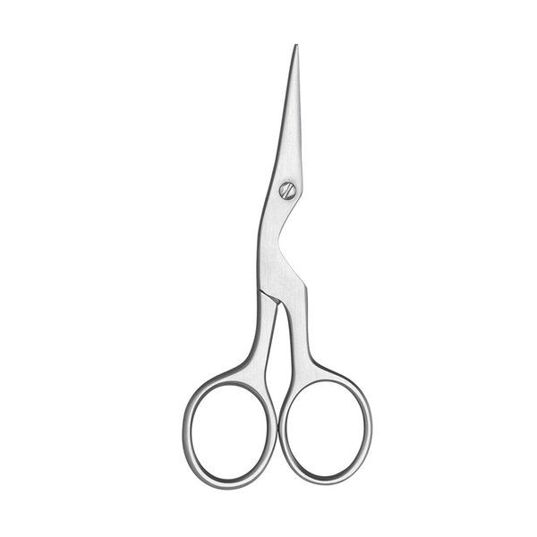 Sua curvatura entre o cabo e a lâmina é feito exatamente para acompanhar a curvatura dos olhos, permitindo que a pessoa possa facilmente enxergar o processo sem que a tesoura cubra a sobrancelha.